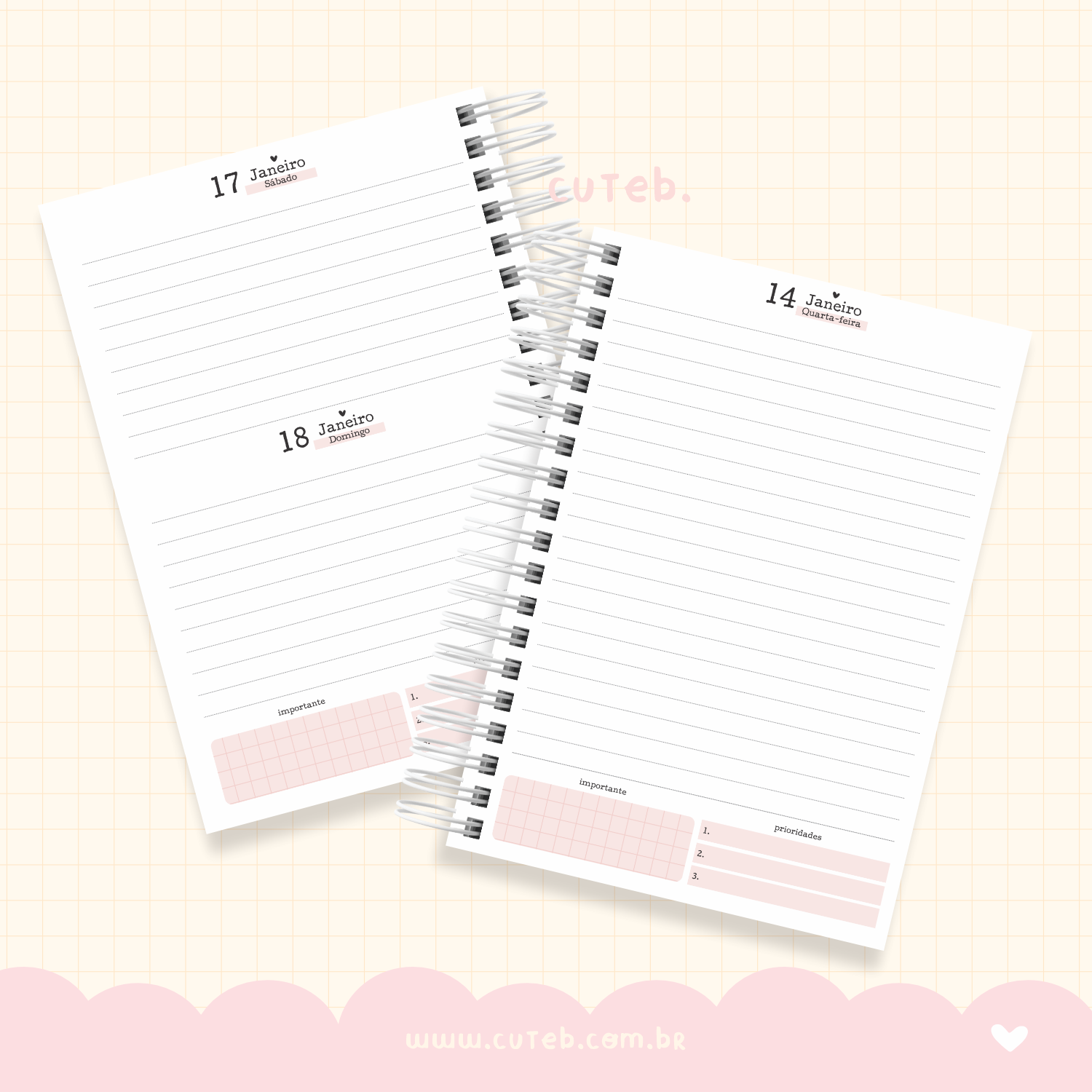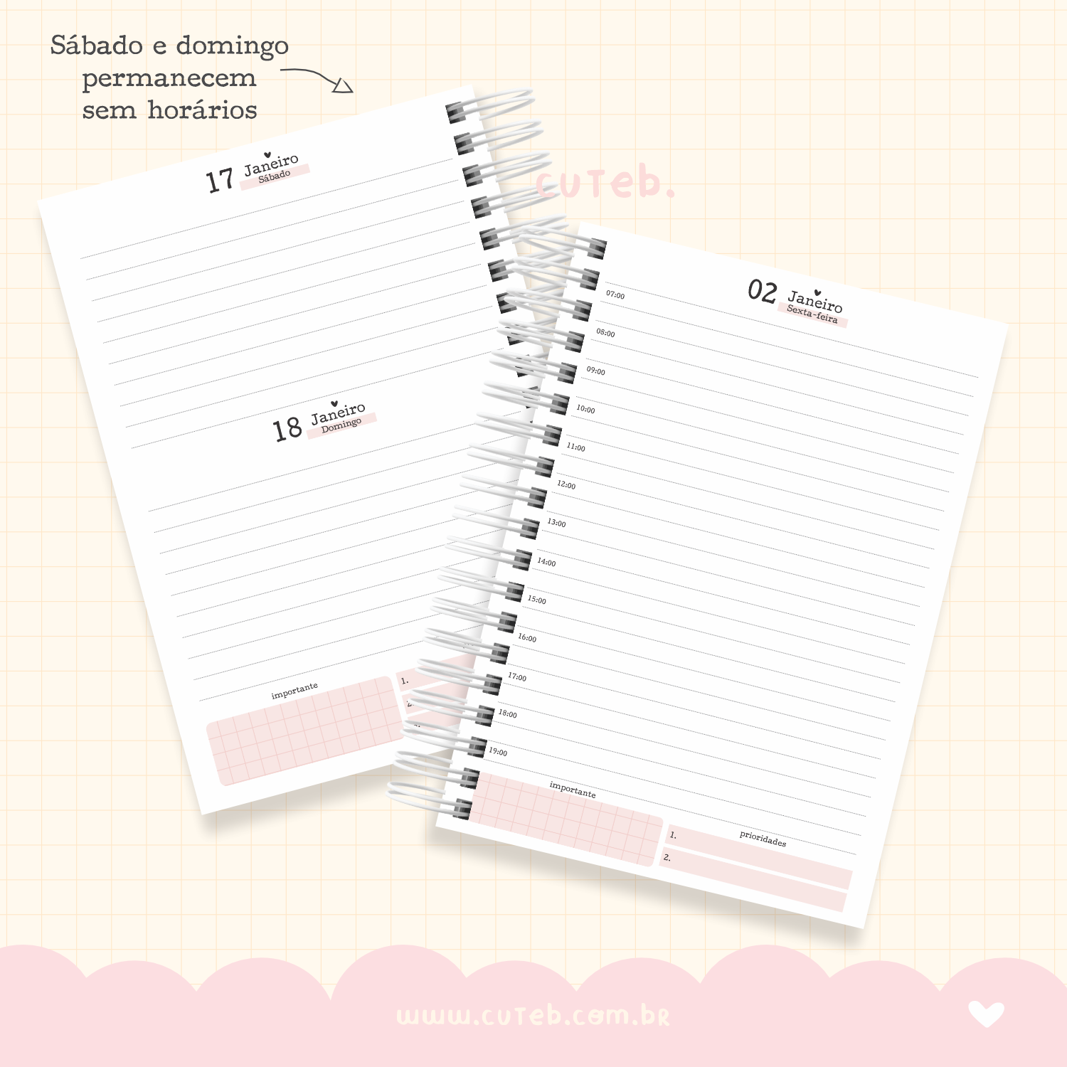 Uma agenda 1 dia por página com sábado e domingo juntos(mesma página) delicada e super clean.